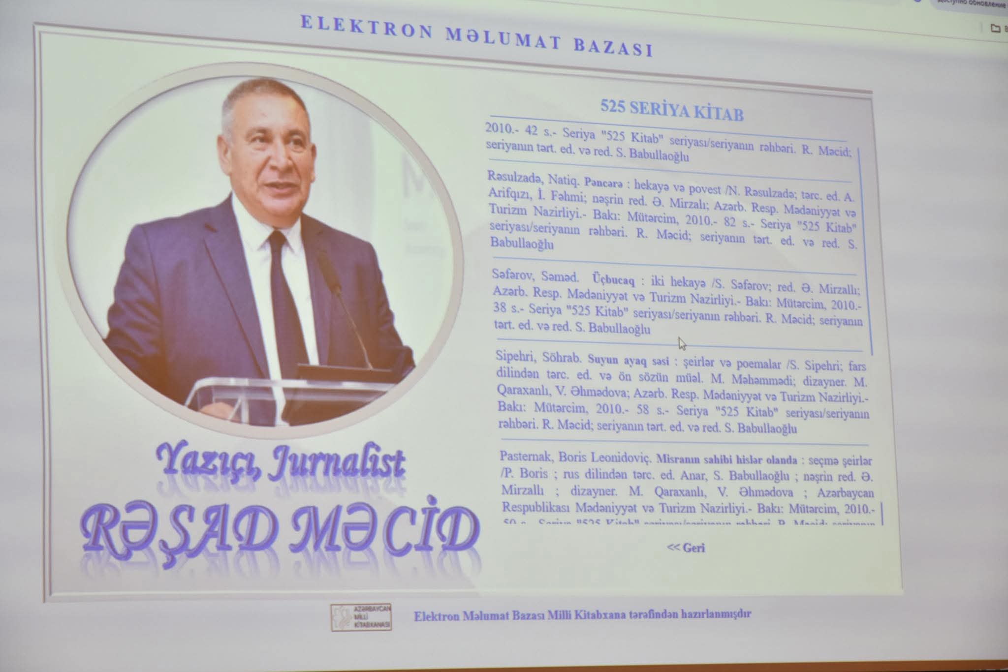 Daha sonra “Rəşad Məcid-60” mövzusunda Elektron məlumat bazasının təqdimat mərasimi keçirilib və bazadakı materiallar tam mətnləri ilə tədbir iştirakçılarına təqdim edilib.