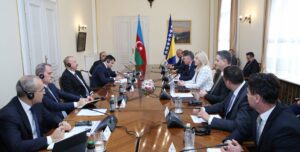 14Apr01:59Sarayevoda Azərbaycan Respublikasının Prezidenti İlham Əliyevin Bosniya və Herseqovinanın Rəyasət Heyətinin Sədri xanım Jelka Tsviyanoviç, Rəyasət Heyətinin üzvləri Jelko Komşiç və Denis Beçiroviç ilə geniş tərkibdə görüşü olub.